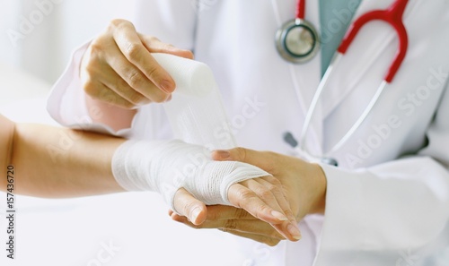 Close-up of female doctor with stethoscope bandaging hand of patient. (Selective Focus)