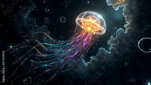 Floating Jellyfish with Glowing Tentacles in Outer Space. The dark space background adds to the otherworldly, serene atmosphere.