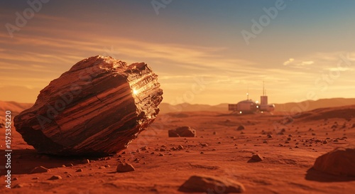 夕焼け火星、巨大な岩と基地 静寂な風景