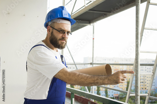 Zły Pracownik budowlany w stroju roboczym i w kasku stoi na dużej wysokości na budowie z planami pod pachą i pokazuje gniewnie palcem.