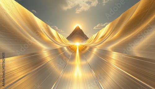 smooth silver and gold metallic gradient background cascades endlessly into a geometric horizon, a tracking shot from a first person perspective rushing toward an apex