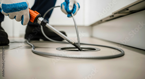 Plumber unclogging a drain with a tool