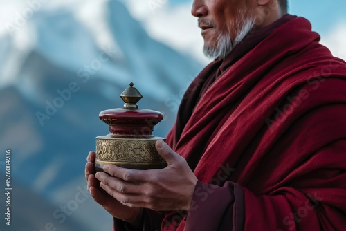 Close up of a monk holding a decorated prayer wheel with mountains in the background, expressing spirituality and tradition