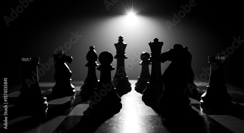 Dramatic Silhouette Chess Pieces on Board, Strategy Game Concept