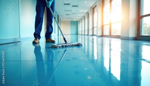 Janitor in uniform mopping bright hallway floor reflecting sunlight. Professional cleaner with bucket and mop ensuring hygiene and cleanliness in office or business space.