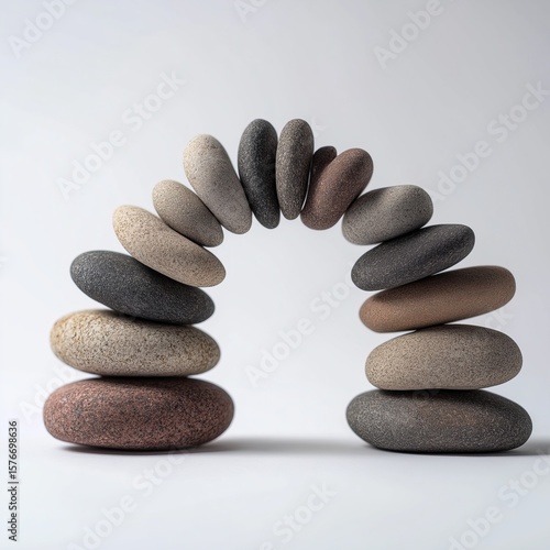 Balanced pebble sculpture mimicking natural rock arch in monochrome palette on pure white. Soothing symbol for eco-friendly product packaging or sustainable lifestyle content visuals.