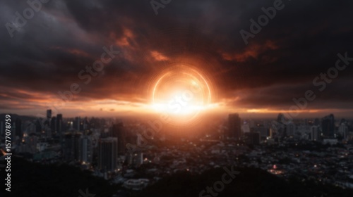 Fiery sunset casts an eerie glow over city skyline, blending rea