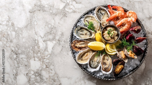 Fresh seafood platter with oysters, shrimp and lemon on ice with marble background and copy space