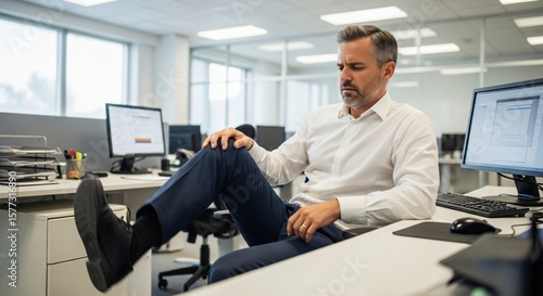 Restless Leg Syndrome Disrupting Concentration in Workplace as Man Struggles With Involuntary Leg Movement