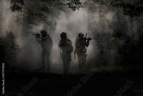 military in the forest . Special Forces Operatives Advancing Through Smoke in Jungle Terrain