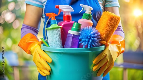 A person wearing yellow rubber gloves holds a bucket filled with various cleaning supplies and tools, ready for household chores