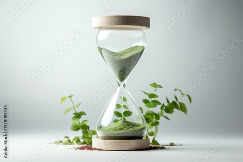 Green sand falling in an hourglass with a small plant growing nearby, symbolizing growth and the passage of time