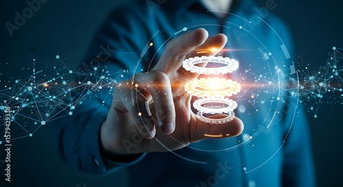 Additive manufacturing and 3D printing concept. An engineer's hand "prints" a holographic 3D object, symbolizing rapid prototyping and industrial innovation.