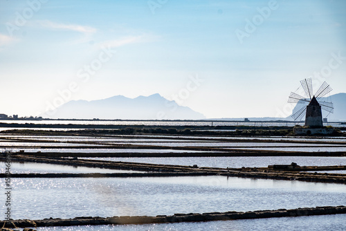Sea saltworks, salt wind mills and pans, manually extracting high-quality salt, near Marsala and Trapani, Sicily, Italy