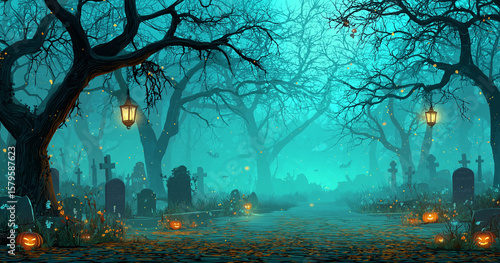 A spooky graveyard with fog, tombstones, and glowing lanterns