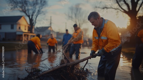 Community volunteers in waterproof gear clearing flood debris from a residential street at sunset, showing resilience, teamwork, and recovery after a disaster