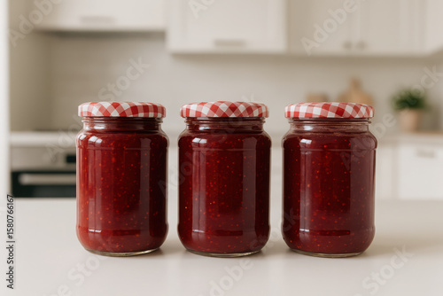 Homemade raspberry jam jars in modern kitchen with red gingham lids