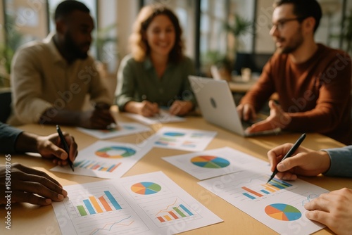 Teamwork Makes the Dream Work: A diverse team collaborates around a table strewn with data charts and graphs, engaged in a lively discussion and analysis.