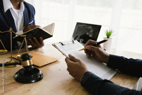 Close-up of lawyer giving legal advice showing gavel, scales and expert examining documents, representing law, justice, court process, agreements and ethical decisions in a formal setting.