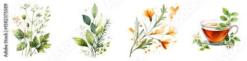 Watercolor Herbal Tea Set: Illustrations of Tea Cup and Plant Bouquets