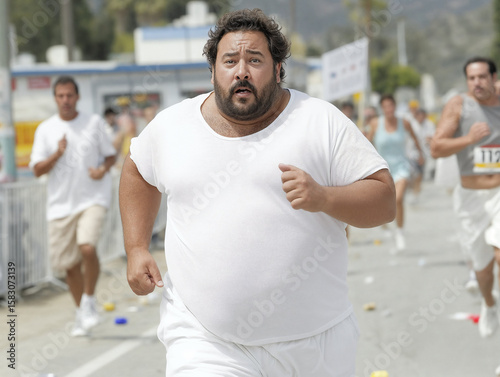 Overweight male runner in white sportswear participating in outdoor city race