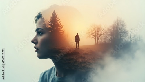 woman's face with superimposed forest landscape and distant figure at sunset. This double exposure evokes feelings of introspection and contemplation.