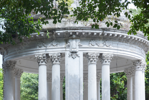 Detailed view of a neoclassical stone tempietto with ornate Corinthian columns in a garden