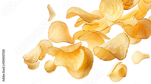 Golden potato crisps elegantly float on a transparent background.