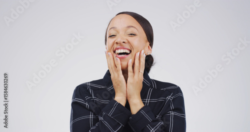 Portrait, smile and woman laugh in studio for good news, excited and winning on white background. Face expression, funny person and LOL for success, achievement and goal with euphoria on space