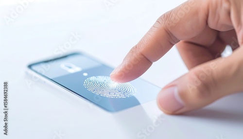A close-up of a finger touching a smartphone screen displaying a glowing fingerprint scanner, representing biometric security and authentication.