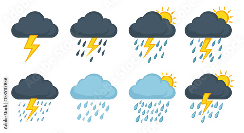 Weather icons set: stormy clouds, lightning, rain, and sun