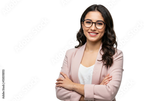 A young indian woman with glasses and a pink blazer smiles confidently with her arms crossed isolated on transparent background