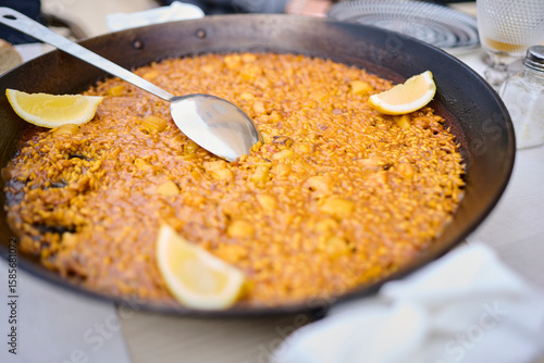 savory arroz a banda dish from Alicante served with squid and ladle in a paella pan at a coastal Mediterranean restaurant.