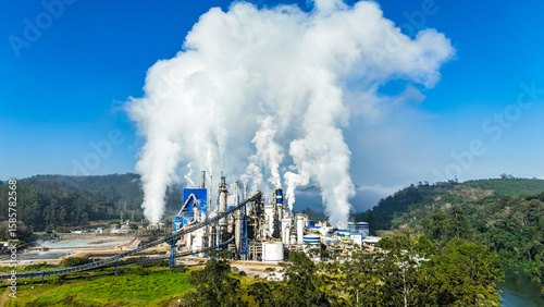 Foto aérea de fábrica de papel e celulose com chaminés fumegantes, caldeiras em operação e poluentes visíveis, mostrando os efeitos da industrialização no meio ambiente