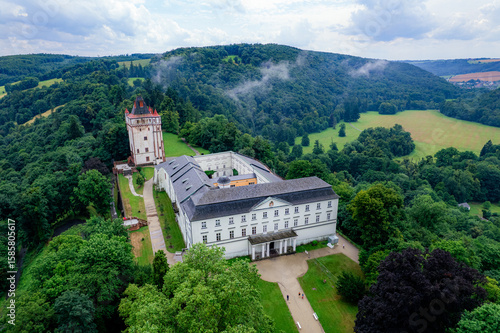Kompleks pałacowo-parkowy w Hradcu nad Moravicí znajduje się na północno-wschodnim cyplu Niskiego Jesionika u ujścia potoku Hradecna do rzeki Moravicy. Panorama z lotu ptaka w lecie.