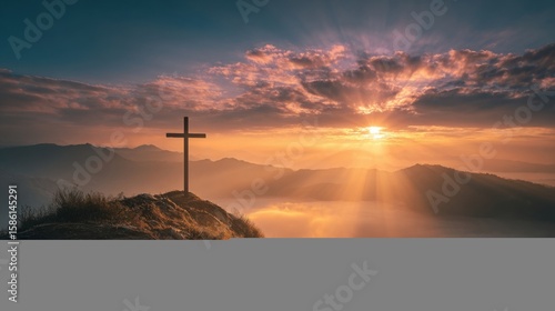 Peaceful sunrise over mountain landscape with cross on hill and colorful sky.