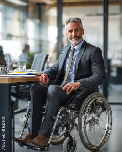 Niepełnosprawny pracownik korporacji pracuje przy komputerze, angażując się w swoje obowiązki w nowoczesnym biurze. Pokazuje profesjonalizm i integrację w miejscu pracy.
