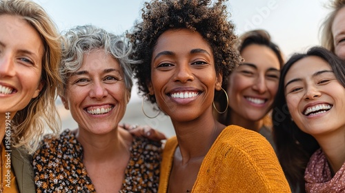 Diverse group of women embracing joy and connection through warm smiles, radiating empowerment and positive friendship vibes together.