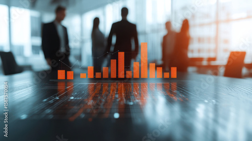 Business infographic illustration with bar chart and line graph overlay wooden table with blurred businesspeople background