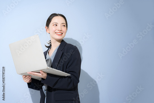 パソコン持ってスーツを着た立つ振り返る若いかわいい女性のビジネスイメージ上半身 水色背景