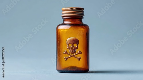 Brown glass bottle with a skull and crossbones symbol, indicating poison or danger, set against a light blue background.