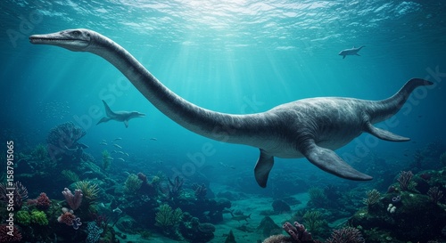 Majestic plesiosaur swimming gracefully in a vibrant underwater ecosystem