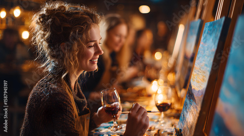 Friends enjoy painting workshop, sipping wine. Group of women socialize during creative activity. Artist painting sunset landscape on canvas. Lifestyle, leisure, relaxing time, fun together.