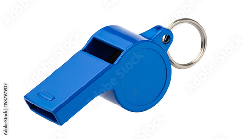 Hanging blue metal whistle with a glossy finish and a small loop for attaching to a lanyard or keychain. Isolated on a transparent background.