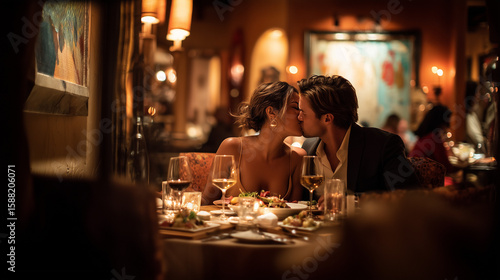 Zakochana para na randce w eleganckiej restauracji. Romantyczna atmosfera, świeczki, wykwintne dania i czuły pocałunek w wyjątkowym otoczeniu.