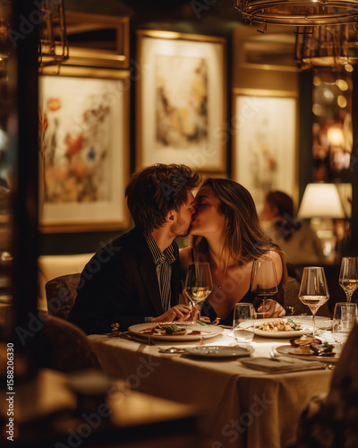 Zakochana para na randce w eleganckiej restauracji. Romantyczna atmosfera, świeczki, wykwintne dania i czuły pocałunek w wyjątkowym otoczeniu.