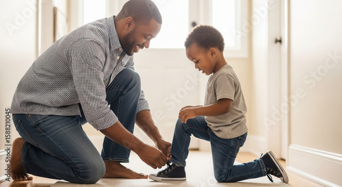 Loving father helping his little son tying shoelaces at home