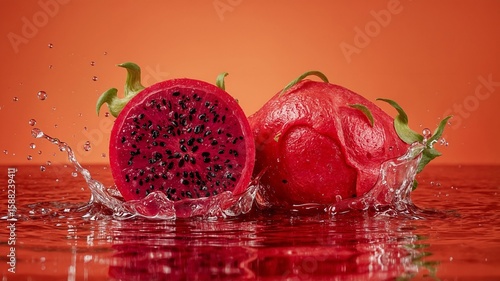 Dua potong buah naga merah yang segar dengan cipratan air. Generative AI Illustration
