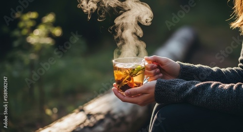 Steaming Hot Herbal Tea in Glass Cup Outdoors with Autumn Leaves and Misty Forest Background