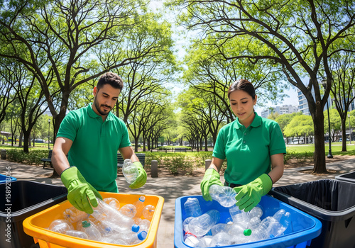 A young adult man and woman, both looking focused, wearing green shirts and gloves, sort plastic bottles into recycling bins outdoors